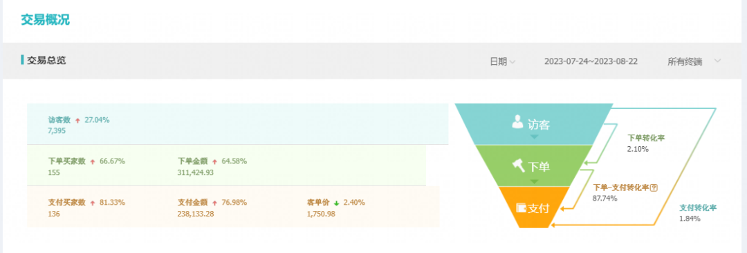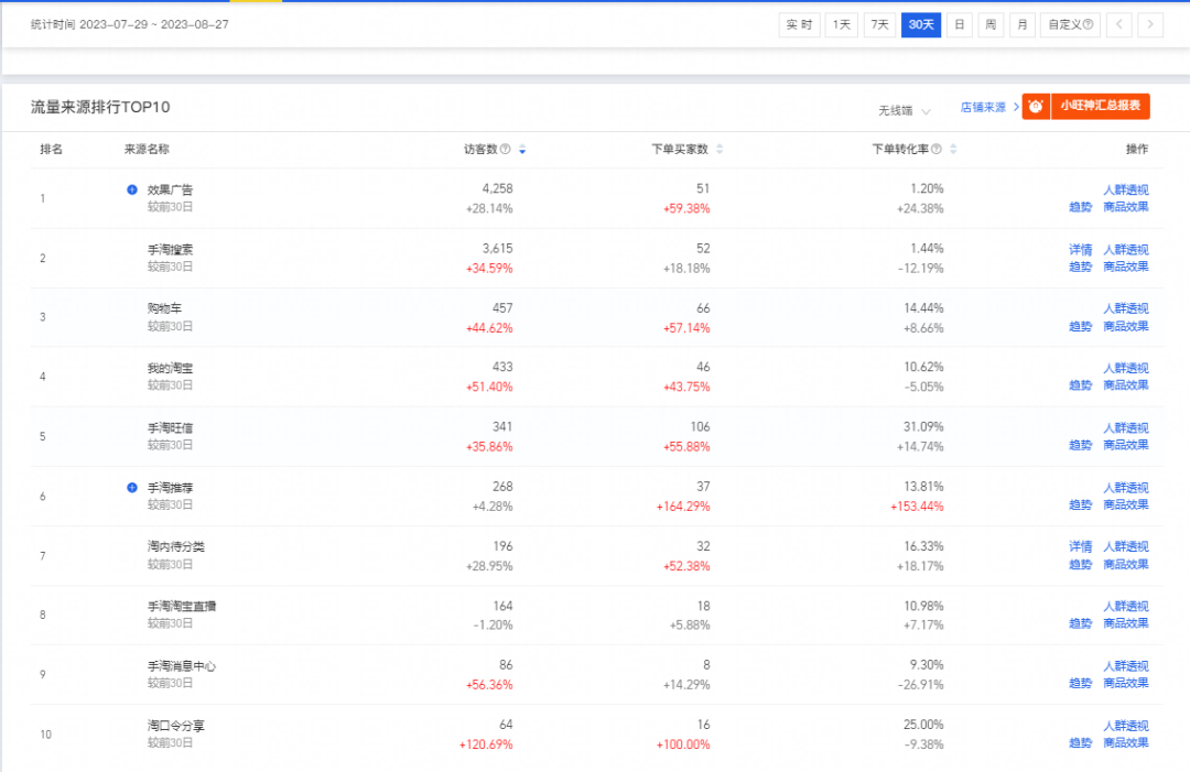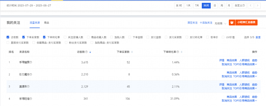 3.店鋪核心詞和轉化人群確定之后,看整體店鋪流量結構,流量結構轉化率對比,免費流量轉化高就重點規劃周期增加免費渠道流量,優化店鋪人群,階段轉化穩定提高。
