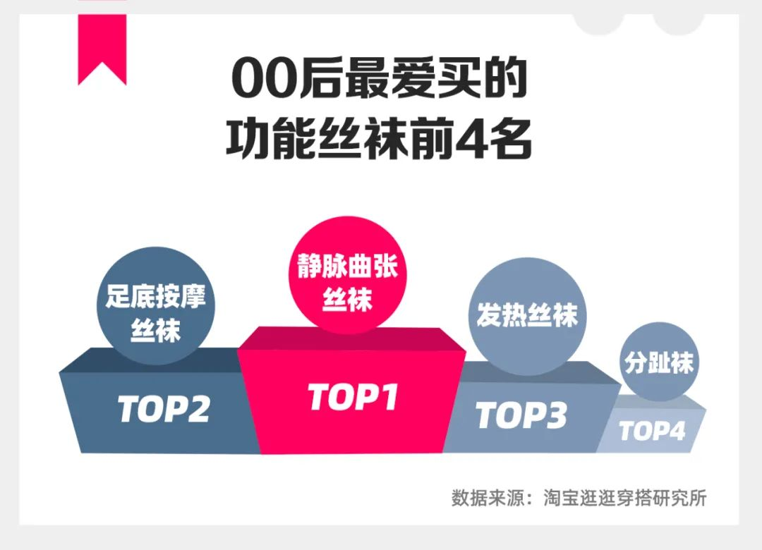 淘寶發布的《絲襪消費流行趨勢報告》顯示:近年來,年輕消費者對絲襪個性化需求愈加明顯,絲襪的種類比過去翻了一倍。蹦迪絲襪、二次元絲襪、土味絲襪、液體絲襪等小眾絲襪同比出現爆發式增長;此外,靜脈曲張絲襪、足底按摩絲襪、發熱絲襪、分趾襪等保健類絲襪銷量同比超過10倍。