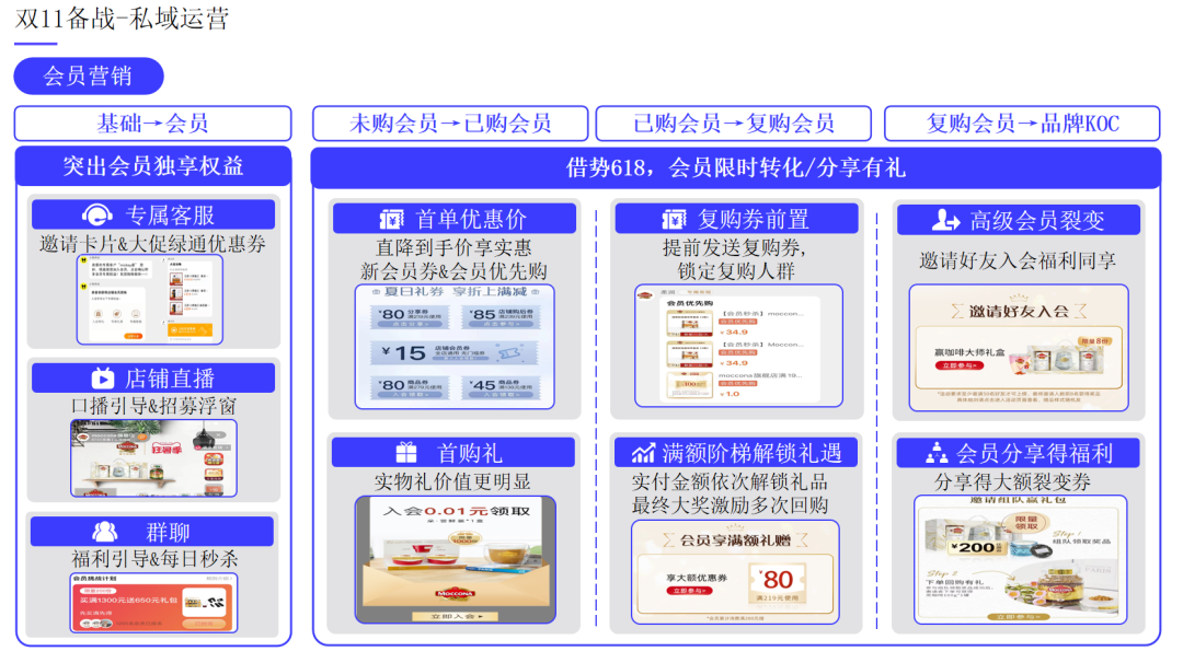 再有,不斷升級(jí)會(huì)員,從基礎(chǔ)訪客到一般會(huì)員,從未購(gòu)會(huì)員、已購(gòu)會(huì)員再到復(fù)購(gòu)會(huì)員,進(jìn)而裂變?yōu)槠放芀OC(關(guān)鍵意見(jiàn)領(lǐng)袖),會(huì)員們享受不同的特色服務(wù)與大額折扣,重視自身會(huì)員地位,加深品牌歸屬感。