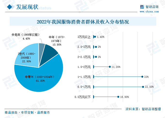 據艾媒咨詢調研數據顯示,中國服飾行業(yè)消費者主要由中青年與“Z世代”人群組成,合計共占84.8%;消費者收入主要集中在5000-10000元與10001-15000元區(qū)間,兩部分占到消費人群的66.5%。在消費升級的背景下,年輕人逐漸成為消費市場的主力,新一代消費者不再局限于產品的功能價值,更追求產品的精神價值和使用體驗,在此類消費趨勢的拉動下,家居服飾市場的消費潛力和動力得到有效激發(fā),推動了家居服飾產業(yè)升級。